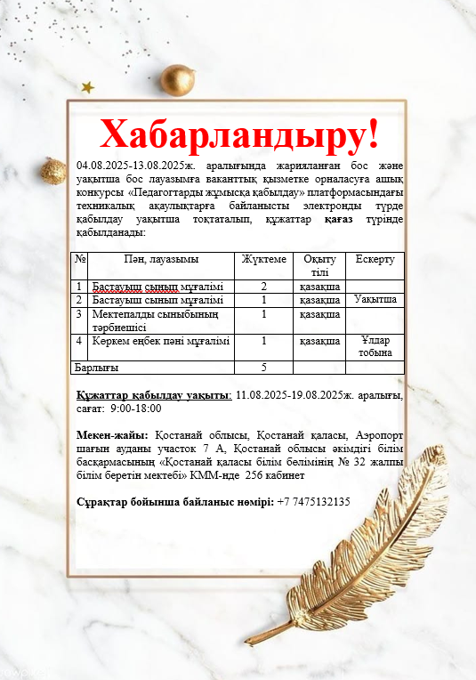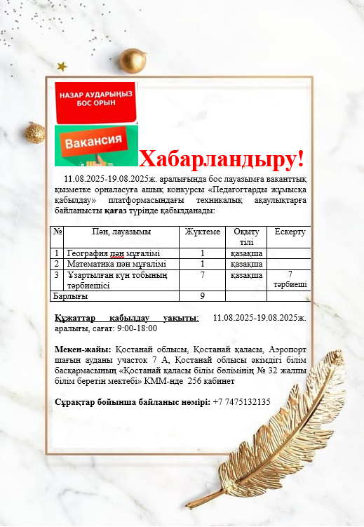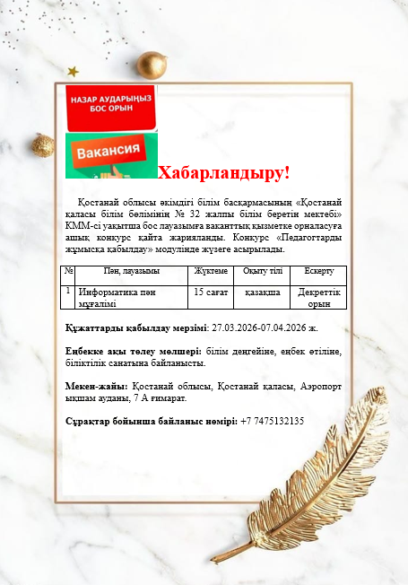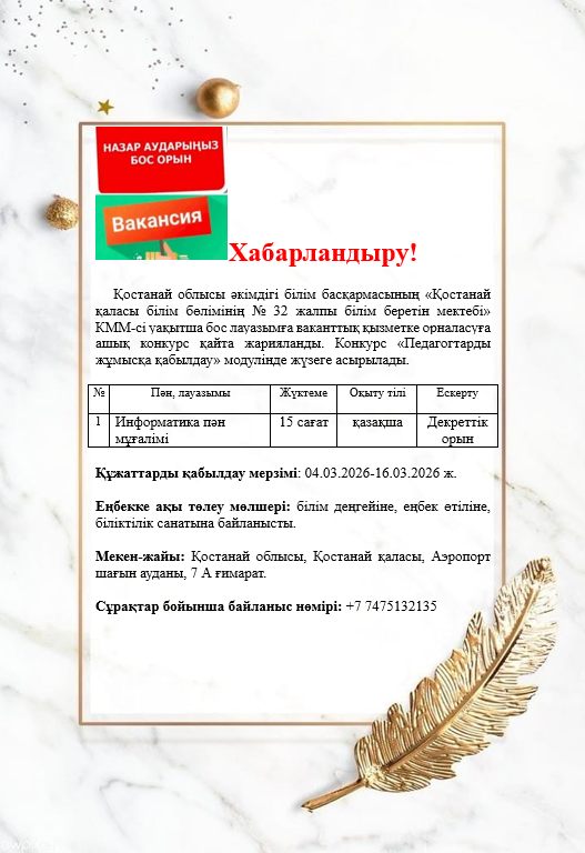 Қостанай облысы әкімдігі білім басқармасының «Қостанай қаласы білім бөлімінің № 32 жалпы білім беретін мектебі»КММ 2026 жылдың 27 наурыздан бастап информатика пән мұғалімі лауазымның уақытша бос орынына орналасуға конкурс қайта жариялайды.